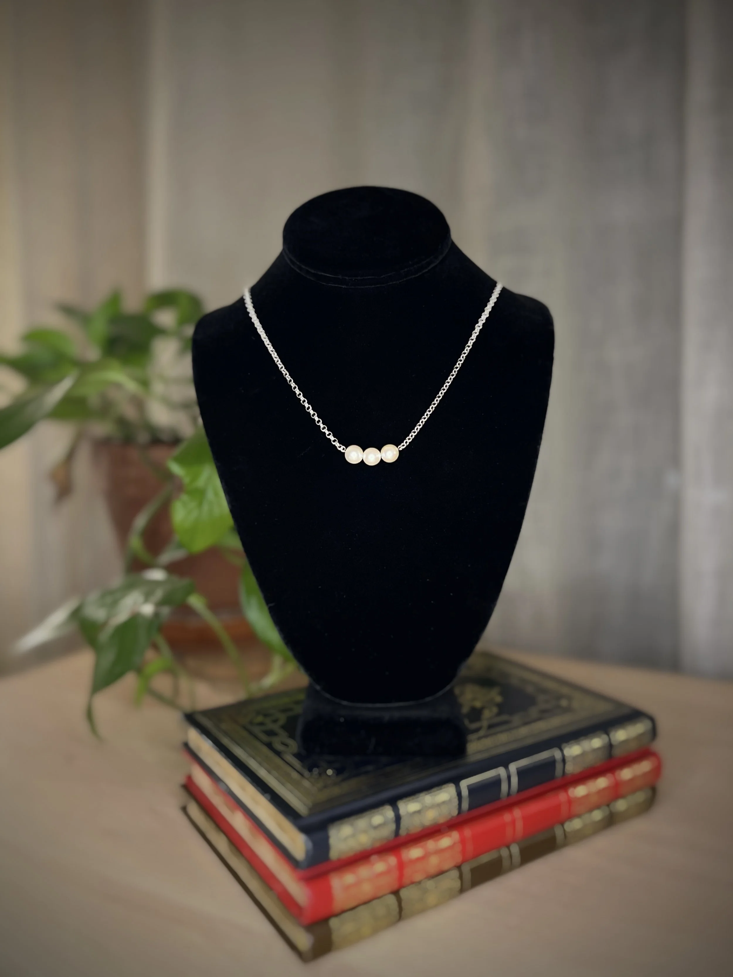 Simple, elegant, and quietly striking—this necklace features three vintage Japanese Akoya pearls, each chosen for its luminous glow and natural symmetry. Their warmth and sheen are framed beautifully by a bold 3mm sterling silver rolo chain, creating a classic silhouette with subtle strength.